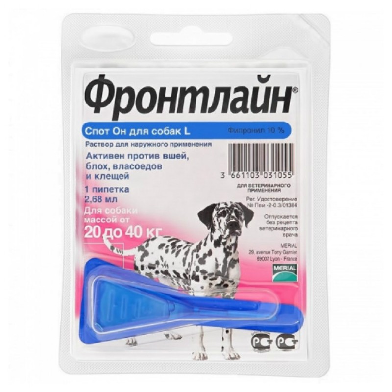 Діюча речовина:фіпроніл-9,8% та S-метопрен-8,8% Країна виробник:Франція Призначення:для боротьби з бліхами, вошами, власоїдами та кліщами (іксодовими, хейлітелами) у собак від 20 до 40 кг