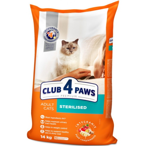 Повнораціонний сухий корм Клуб 4 Лапи Premium для дорослих стерилізованих кішок. Забезпечує вихованця всіма необхідними вітамінами, мінералами та поживними речовинами. Допомагає поліпшити роботу внутрішніх органів кішки, а також зберегти її оптимальну вагу і красу.