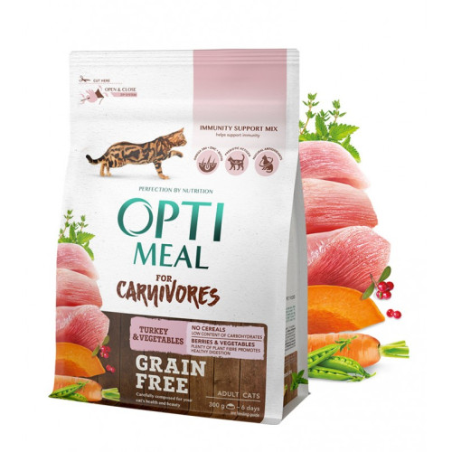 Optimeal Turkey & Vegetables - беззерновий повнораціонний сухий корм для дорослих кішок (у віці від 1 до 7 років) з м'ясом індички і овочами. Удосконалена формула для підтримки імунітету. Підходить для кішок з чутливим травленням.