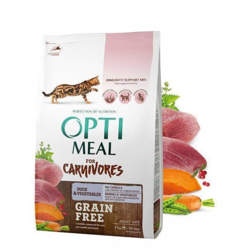 Optimeal for Carnivores Duck & Vegetable - беззерновий повнораціонний сухий корм для дорослих кішок (у віці від 1 до 7 років) з м'ясом качки і овочами. Підходить для кішок з чутливим травленням.