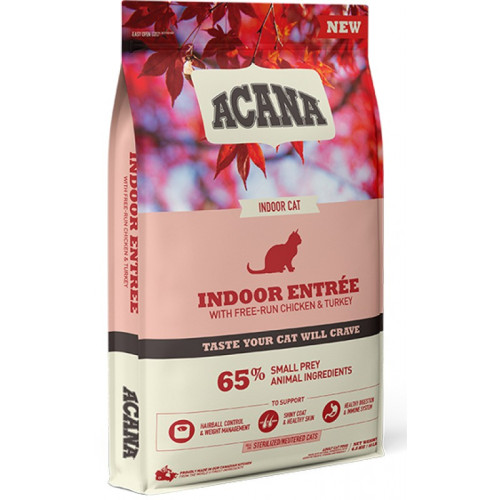 Acana Indoor Entree Cat – високоживильний та біологічно відповідний сухий корм на основі курячого м'яса, оселедця, індички та кролика для дорослих домашніх котів усіх порід з низьким рівнем активності. Завдяки ретельно підібраним інгредієнтам та високій якості сировини раціон максимально схожий з харчуванням кішки в природному середовищі, тому формула під назвою “Домашня страва” гарантує всебічне забезпечення потреб організму Вашого улюбленого мініатюрного хижака.