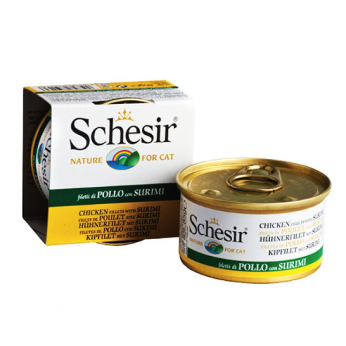 Повноцінний вологий корм Schesir з натуральними м'ясом Курки і Сурімі містить всі необхідні для щоденного раціону кішки поживні речовини, мікро- та макроелементи, вітаміни і таурин. Для приготування корму Schesir використовуються натуральні та екологічно чисті продукти, без додавання штучних барвників та консервантів.