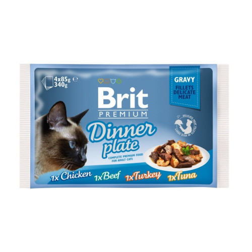 Повнораціонний вологий корм преміум-класу для дорослих кішок: "Обідня тарілка" в соусі. Набір містить 4 шт. смачних павуковий в ароматному соусі: курка, яловичина, індичка і тунець.