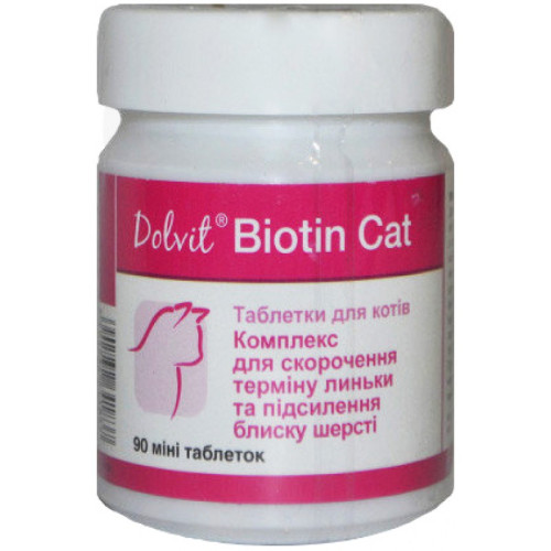 Dolfos Dolvit Biotin Cat - комплексний вітамінно-мінеральний препарат з високим вмістом біотину (вітамін H), іншими вітамінами і мінералами (сульфат цинку і гідрат міді в хелатній формі), підтримує здоровий розвиток тварини, пігментацію шкіри і шерсті, сприяє зміцненню кігтів і загоєнню дрібних ран шкіри. При регулярному застосуванні комплексу досягається відмінний вигляд виставкових кішок.
