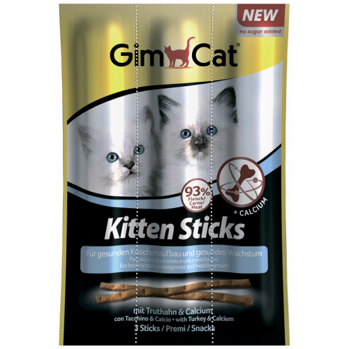 Палички GimCat Kitten Sticks для маленьких кошенят. До їх складу входить м'ясо індички, а також таурин, кальцій і вітаміни А, D3 і Е для здорового розвитку тварини.