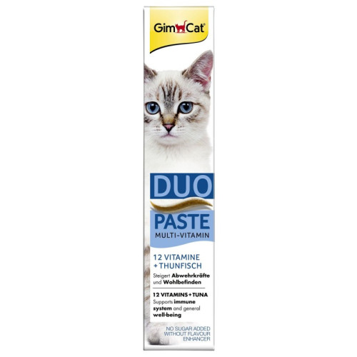 Паста Gimcat Multi-Vitamin Duo-Paste Tuna and 12 Vitamins - мультивітамінні ласощі для кішки. Комбінація з апетитного тунця і 12 життєво важливих вітамінів зміцнює захисні сили організму і перетворює цю пасту на делікатес.