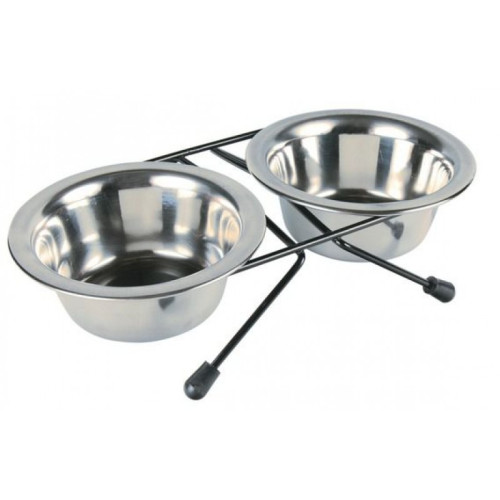 Миски з нержавіючої сталі Trixie на підставці підійдуть і кішкам, і собакам. Дві сталеві миски поміщаються у чорну металеву підставку з порошковим покриттям. Гумові ніжки підставки не дозволять чотирилапому улюбленцю легко пересувати і перевертати її. Миски можуть використовуватись для корму або води.