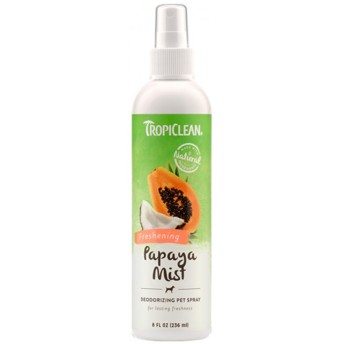 TropiClean Papaya Mist - дезодорант-антистатик з ароматом тропічних фруктів. Papaya Mist додає додаткову свіжість після купання або між купаннями. Знижує статичну електрику на шерсті тварин. Свіжий аромат тропічних фруктів зберігається протягом декількох днів. Застосовується для собак, кішок, тхорів, хом'яків, кроликів та інших дрібних тварин.