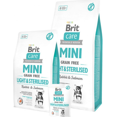 Сухий корм для собак Brit Care GF Mini Light & Sterilised - це збалансований беззерновий корм супер-преміум класу, з прекрасною засвоюваністю, який забезпечує підтримку імунітету і здоров'я стерилізованих собак малих порід схильних до ожиріння. Рецептура корму містить єдине джерело білка - м'ясо кролика, таким чином, він підходить для собак схильних до алергії на куряче м'ясо і зернові - пшеницю, кукурудзу та інше.