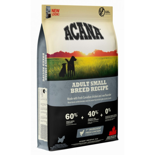 Високопротеїнова, з помірним вмістом жирів і низьким вуглеводів, корм ACANA близький до природного харчування собак малих порід, не містить зерна і швидких вуглеводів, таких як рис, тапиока або картопля, а багатий тваринними білками, які забезпечують здоровий розвиток і відмінну форму Вашої собаки.