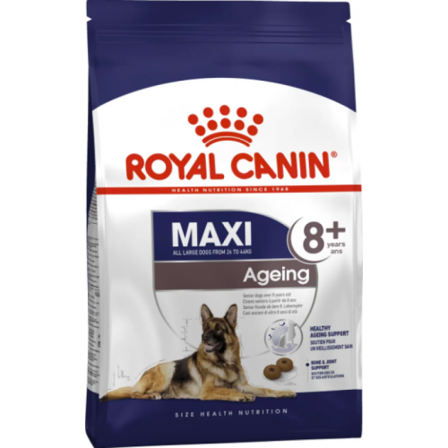 Royal Canin maxi Ageing 8+ - повнораціонний сухий корм для старіючих собак великих розмірів (вага собаки від 26 до 44 кг) у віці старше 8 років. Спеціально підібраний комплекс поживних речовин перешкоджає процесам старіння у літніх собак великих порід. Корм містить жирні кислоти EPA-DHA і особливий комплекс антиоксидантів для нейтралізації вільних радикалів. Підтримує здоров'я кісток і суглобів у собак великих порід, що піддаються навантаженням, за рахунок вмісту глюкозаміну і хондроїтину.