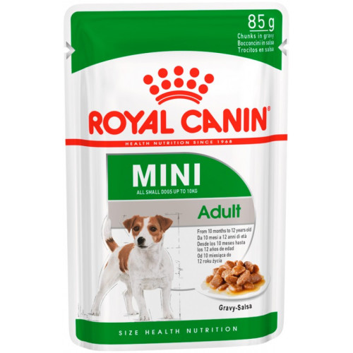 Royal Canin Mini Adult – повнораціонний вологий корм підтримки фізичної форми собак дрібних розмірів (вага дорослого собаки до 10 кг). L-карнітин стимулює метаболізм жирів в організмі. Задовольняє високі енергетичні потреби собак дрібних розмірів завдяки точно розрахованій енергоємності раціону (3737 ккал/кг) та збалансованому вмісту білка (27%). Консерви живлять шерсть завдяки включенню до складу корму сірковмісних амінокислот (метіонін та цистин), жирних кислот Омега 6 та вітаміну А.