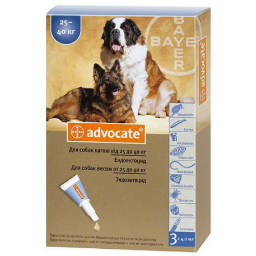 Спосіб застосування:Адвокат можна застосовувати щенятам старше 7-тижневого віку. Обробку собак масою менше 1 кг, вагітних і годуючих сук слід проводити під наглядом ветеринарного лікаря. Адвокат наносять на суху неушкоджену шкіру місця, недоступні для злизування, безпосередньо на шкіру між лопатками біля основи шиї. При обробці великих тварин вміст піпеток наносять на шкіру 3-4 місця.