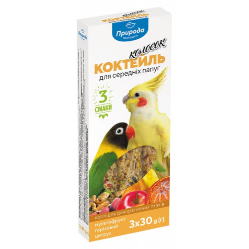 Ласощі для середніх папуг Природа Коктейль «Колосок» 3 шт. (Мультифрукт, горіх, цитрус). Суміш різноманітних фруктів - необхідна сукупність вуглеводів, а також пектинових речовин, які впливають на загальний імунітет птахів. Також фрукти - це джерело необхідних вітамінів. Горіхи - це джерело енергії і корисного білка, в них багато цинку, заліза і кальцію, тому це незамінна частина раціону птахів, вони сприяють нормальному обміну речовин і зміцненню іммунітета. Зневоднені частки цитрусів містять велику кількість фруктових кислот і полісахариди. Полісахариди в складі цитрусових активізують захисні функції організму, попереджають інфекційні захворювання.