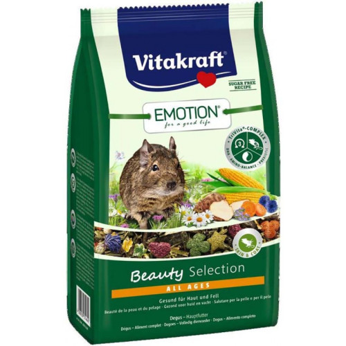 Корм для дегу Vitakraft Emotion Beauty на всіх стадіях життя. Склад корму підібраний спеціально для дегу і містить гранули люцерни з високим вмістом клітковини, а також смачний топінамбур і корисні квіти. Дорогоцінні масла, що входять до складу, посприяють блиску шерсті і здоров'ю шкіри. Без додавання цукру, штучних барвників і консервантів. Смачна і поживна суміш в упаковці, що зберігає аромат і свіжість корму.