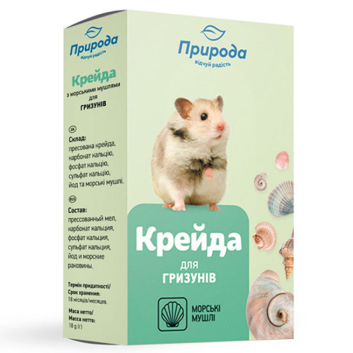 Крейда з морськими мушлями для гризунів. Мінеральні компоненти мають важливе значення для формування кісток, зубів і шерсті. Важливий аспект для вживання тваринами пресованого мінералу - постійне зростання зубів, які вимагають щоденного сточування гризінням твердих матеріалів.