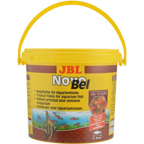 Корм JBL Novo Bel містить всі компоненти, пристосованих до живильних потреб акваріумних риб, зібрані в одній збалансованій суміші: риба і рибопродукти, овочі, зернові, дріжджі, рослинні речовини, водорості, яйця і яєчні продукти, а також рачки. Живильні і легко засвоювані пластівці середнього розміру завдяки поступовому зануренню/плаванню дозволяють створити для всіх риб середніх і верхніх шарів води ідеальні умови для харчування. Стабілізований вітамін С та інші життєво важливі вітаміни, а також біоелемент Інозіт забезпечують здоровий ріст і зміцнення імунітету. Пластівці можуть згодовуватися кілька разів на день щодня, проте завжди маленькими порціями, які можуть бути з'їдені за кілька хвилин.