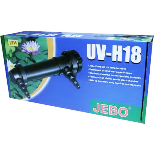 Jebo UV-H18 - ультрафіолетовий стерилізатор для очищення і знезараження акваріумної або ставкової води. Підходить для акваріумів до 900 літрів. Стерилізатор забезпечує потужне ультрафіолетове випромінювання, яке знищує водорості і всі негативні бактерії та грибок. Ультрафіолетові промені глибоко проникають всередину клітини і руйнують їх ДНК, в результаті, вода стає чистою, здоровою і прозорою.