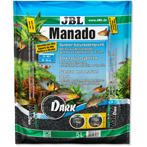 JBL Manado DARK - темний натуральний субстрат для акваріумів. Ідеально підходить для догляду за рослинами в прісноводних акваріумах. Пориста структура сприяє зростанню коренів. Підходить для донних риб. Поживний буфер з високим вмістом заліза. Поглинає надлишок поживних речовин і вивільняти їх, коли необхідно. Високий вміст заліза поглинають корені рослин. Активує грунтову флору, прискорюючи колонізацію корисними грунтовими бактеріями. Скорочує небажаний ріст водоростей, знімає навантаження з фільтра і очищає воду. Підкреслює насичене забарвлення риб завдяки темно-коричневого кольору, який гармонує з зеленими і червоними тонами рослин