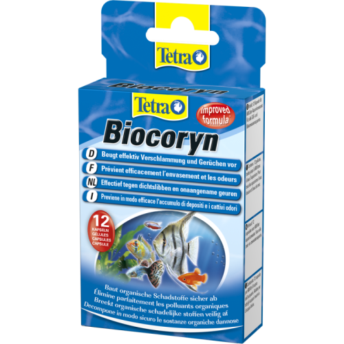 Tetra Biocoryn - препарат, який містить високоактивні ензими і бактеріальні концентрати, що дезінфікують воду і прискорюють розкладання органічних речовин, таких як залишки корму, рослин, продукти життєдіяльності риб. Препарат Biocoryn застосовується для біологічного очищення акваріума від отруйних продуктів розпаду органіки і кормових залишків за допомогою активних речовин і бактеріальних концентратів.