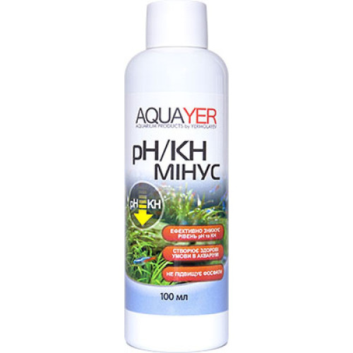 AQUAYER pH/KH мінус - ефективний засіб для зниження карбонатної жорсткості (КН) і рН води в акваріумі. Багато тропічних та прісноводних риб краще відчувають себе в воді з карбонатною твердістю (КН) не більше 4 ° dKH (німецькі градуси жорсткості) і при рН нижче 7.5, а рослини при таких параметрах води краще ростуть. Регулярне використання pH/KH мінус дозволяє підтримувати оптимальні рН і карбонатну жорсткість. Не підвищує концентрацію фосфатів в акваріумній воді.