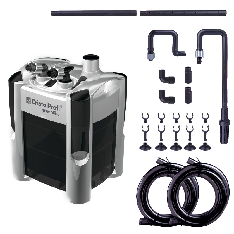 силиконовые шланги, трубка забора воды с защитной сеткой, трубка выхода воды с рассекателем (флейтой), губки для механической фильтрации (синтепон) 3 шт, контейнеры под наполнители 3 шт, переходники, присоски, UV лампа 9 Вт