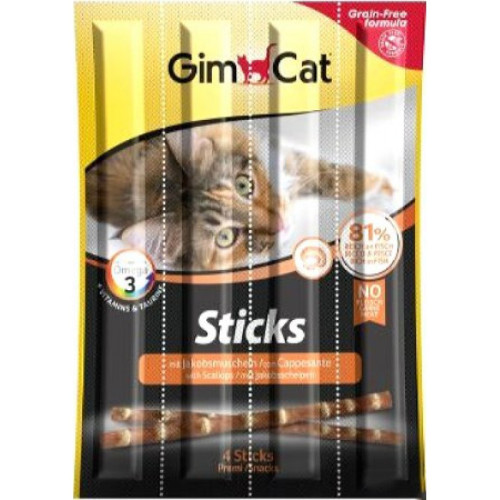 Лакомство для кошек Gimpet в виде мясных палочек (4 шт) из лосося, гребешков. Состав: 53% сочного лосося, 28% вкусной трески, 4% гребешков, Омега 3, витамины A, D3, E, таурин.