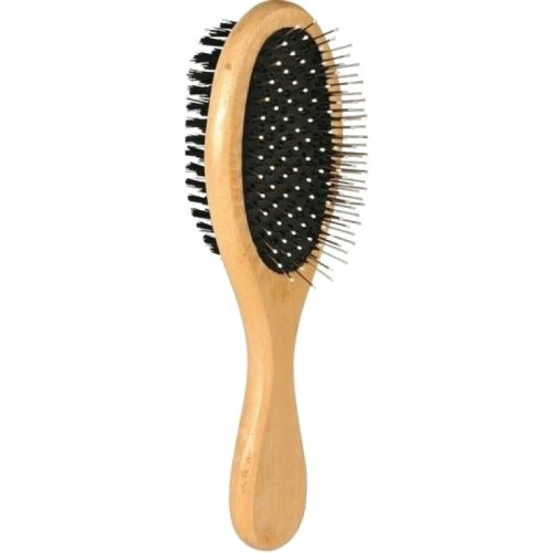 Двухсторонняя щетка-пуходерка Trixie для собак с щетиной из исскуственного материала с одной стороны и стальными щетинками имеющими на концах защитные шарики, с другой стороны. Подходит для кота или собаки с длинной и короткой шерстью и позволяет привести шерсть животного в полный порядок. Расчесывает, снимает пыль, удаляет отмершие волоски, затем полирует и придает блеск. Подходит также для собак с чувствительной и воспаленной кожей, так как позволяет мягко вычесать шерсть.