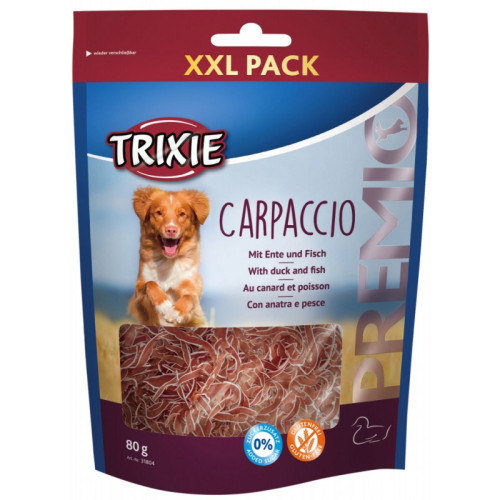 Лакомство Trixie Premio Carpaccio для собак с уткой и рыбой производится из качественного и полностью безопасного для здоровья животного мяса. Содержание мяса — 65%, рыбы — 20%. Без добавления консервантов и сахара. Богато протеинами. Не содержит глютена. В пищевой герметичной упаковке с ZIP-замком.