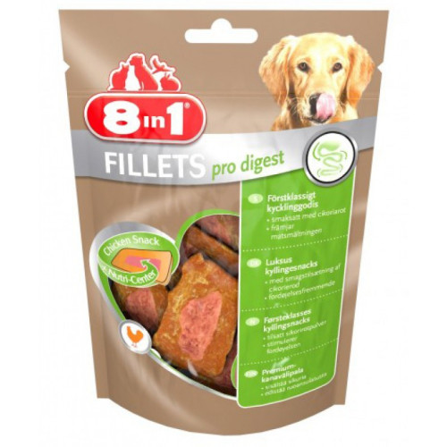 Лакомства для собак 8in1 Fillets ProDigest обогащены специальными ингредиентами для улучшения пищеварения. Куриное филе наивысшего качества с уникальной питательной сердцевиной, с добавлением цикория.