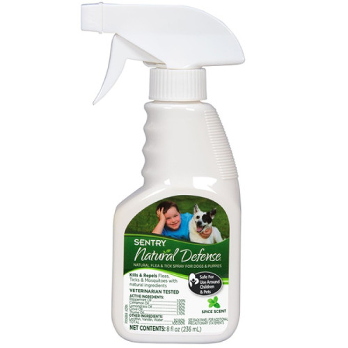 Спрей Sentry Natural Defense Dog от блох, клещей и комаров для собак и щенков. Убивает и отпугивает блох, клещей и комаров с помощью натуральных ингредиентов. Безопаснен для общения детей с обработанными животными. С ароматом пряностей. Можно обрабатывать собаку как внутри помещения, так и на улице.