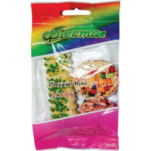 Десерт-микс «Фиеста» «Ассорти» (шарик, трубочка, тарталетка) для грызунов – это запеченная зерновая смесь, упакованная в вафельную корзинку.