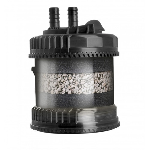 Внешний фильтр MULTIKANI идет в комплекте с насосом высокой мощности и канистрой, заполненной механическим (губки) и химическим (цеолит) наполнителями. Объем фильтрационного наполнителя одной канистры рассчитан примерно на аквариумы до 50 литров. При необходимости возможно увеличение объема фильтрационного материала путем доукомплектования фильтра дополнительными модулями (до 8 штук) с различными наполнителями (уголь, цеолит, керамика, химический наполнитель PhosMax, предназначенный для удаления из аквариума излишков фосфатов).